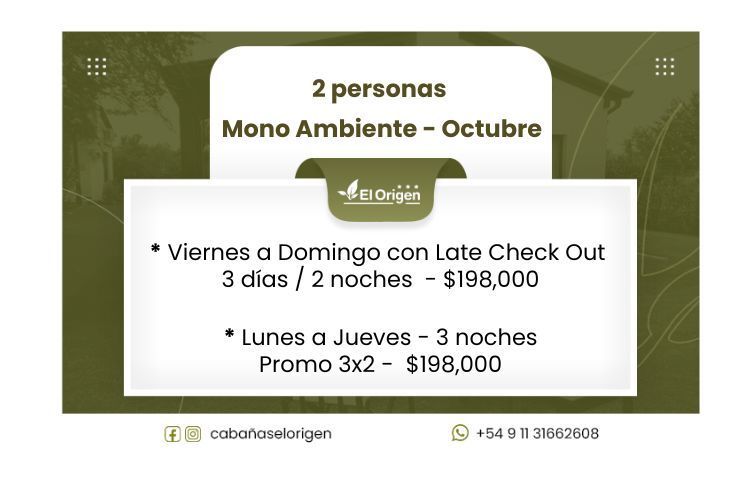 30% del valor de la estadía en concepto de ANTICIPO para efectuar la Reserva mediante Depósito o Transferencia Bancaria. *SALDO*: EFECTIVO billetes al ingresar al complejo. No válidos para fines de semana largos ni feriados. Oferta válida para estadías hasta el 31/OCT/2025